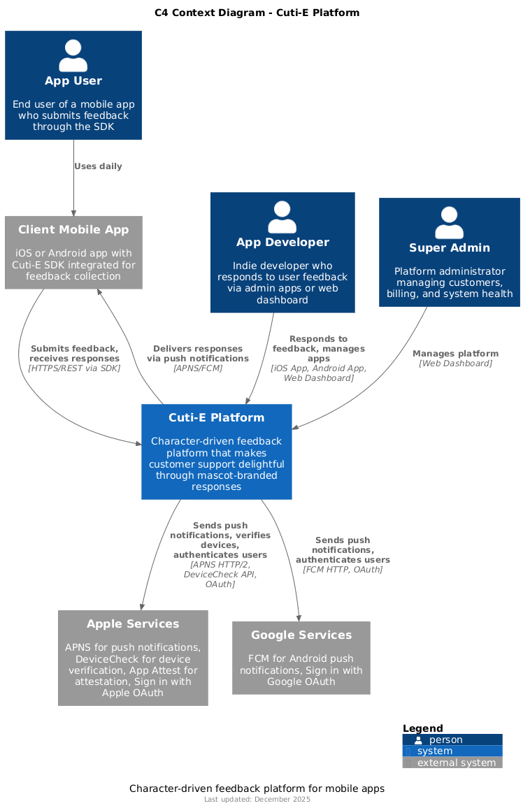 Shows the Cuti-E platform in relation to its users and external systems: - Users: App Users, App Developers, Super Admins - External Systems: Apple Services, Google Services, Client Apps